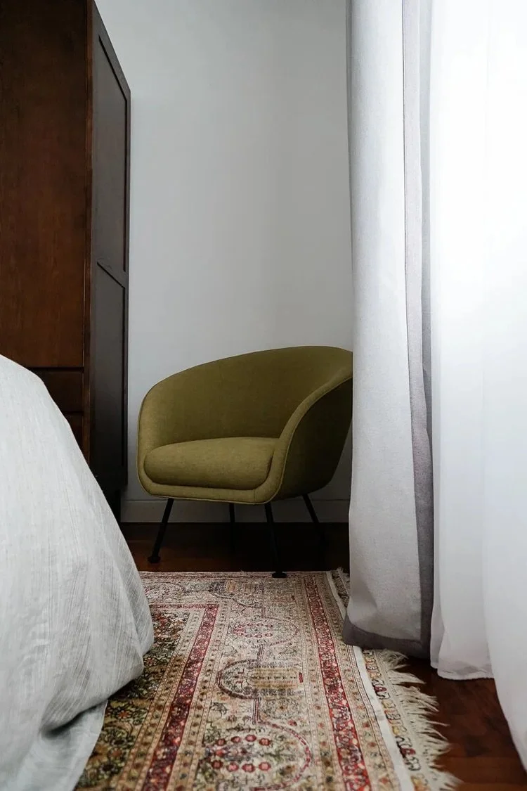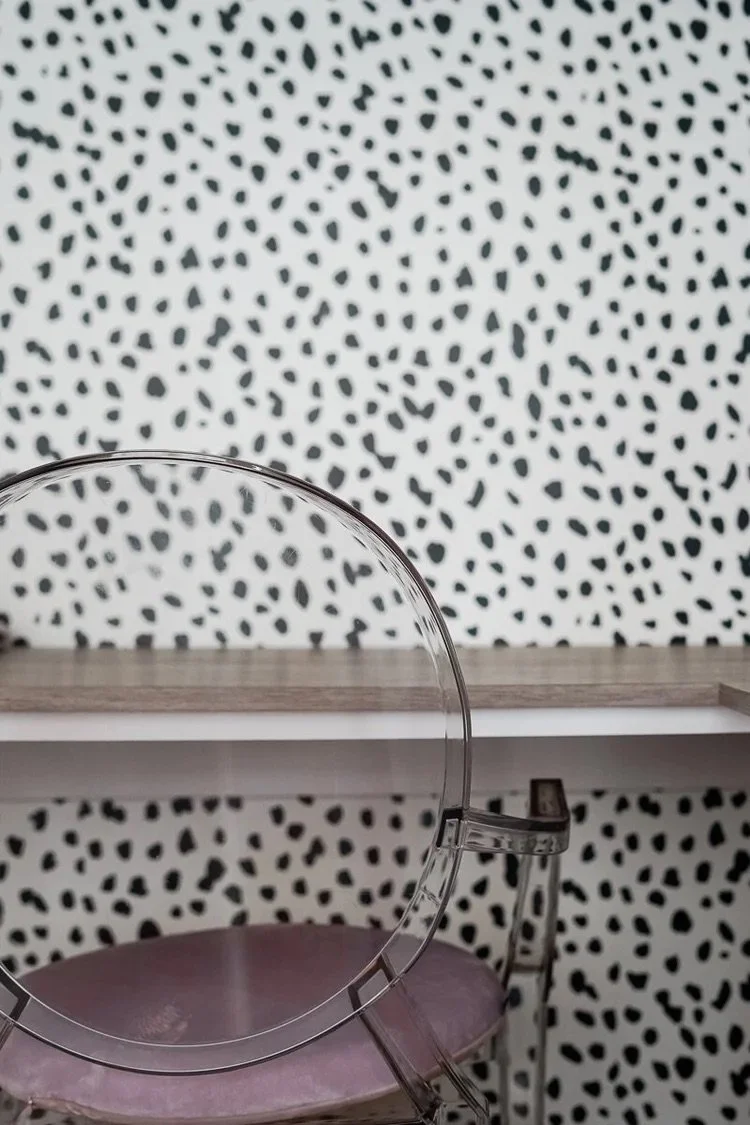 The children’s bedrooms were each tailored to their individual personalities, with homeschooling spaces as a key area for each room. In one room, a built-in niche was created where a closet had once been fitted, optimizing view and comfort, with pops of color at the side of the headboard using a special wallpaper. In another room, fun elements like hand-dotted polka dots, a neon script night light, and soft blush linen curtains create a relaxing but upbeat tone for the young teen’s hangout and study areas.