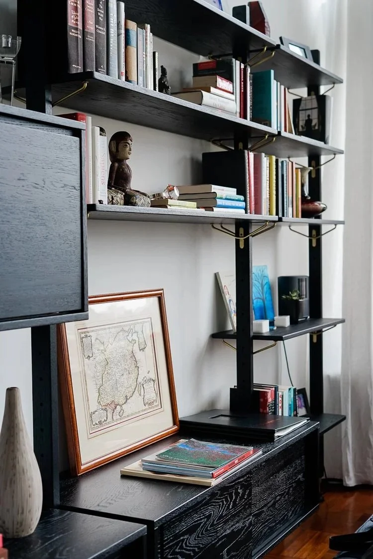 The large double-height living room became an eclectic space for the sophisticate - reading, cocktail sipping, and piano playing. Electric, deep, and ocean blues feature here, in a bespoke painted screen and curated artworks, grounded in grays and earthy neutrals, brightened by the defining double-height lookout windows. A structured new leather sofa and armchair were added to create the lounge, while a beautifully crafted black wall shelving unit expands across the main wall, serving as a library and bar, with an enclosed compartment within the unit.